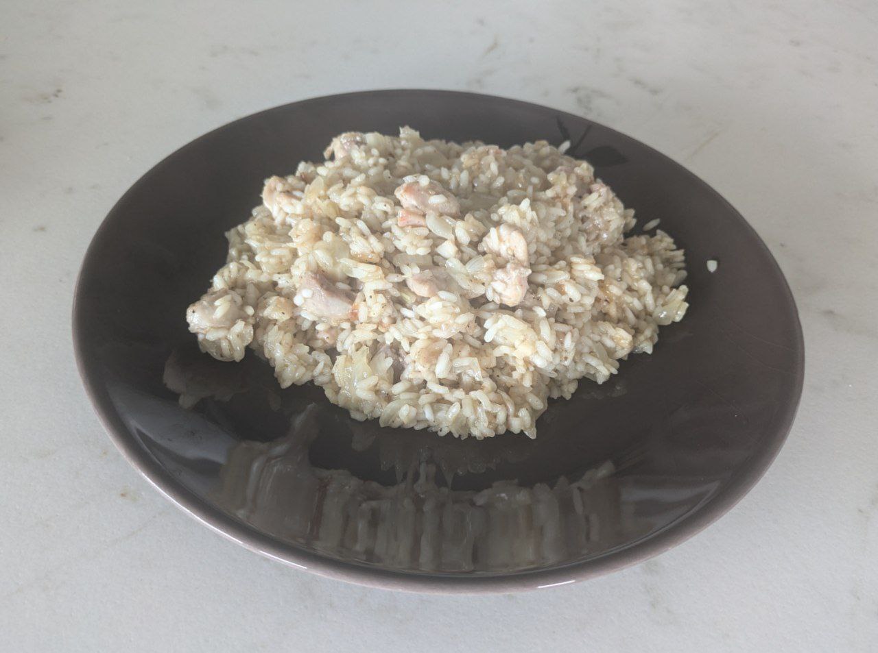 7. Añadir el arroz a la sartén con el ajo y la cebolla, y dejar que se dore un poco. Luego, añadir el pollo y el caldo. Aprovechar bien los restos que queden pegados en la sartén del pollo.