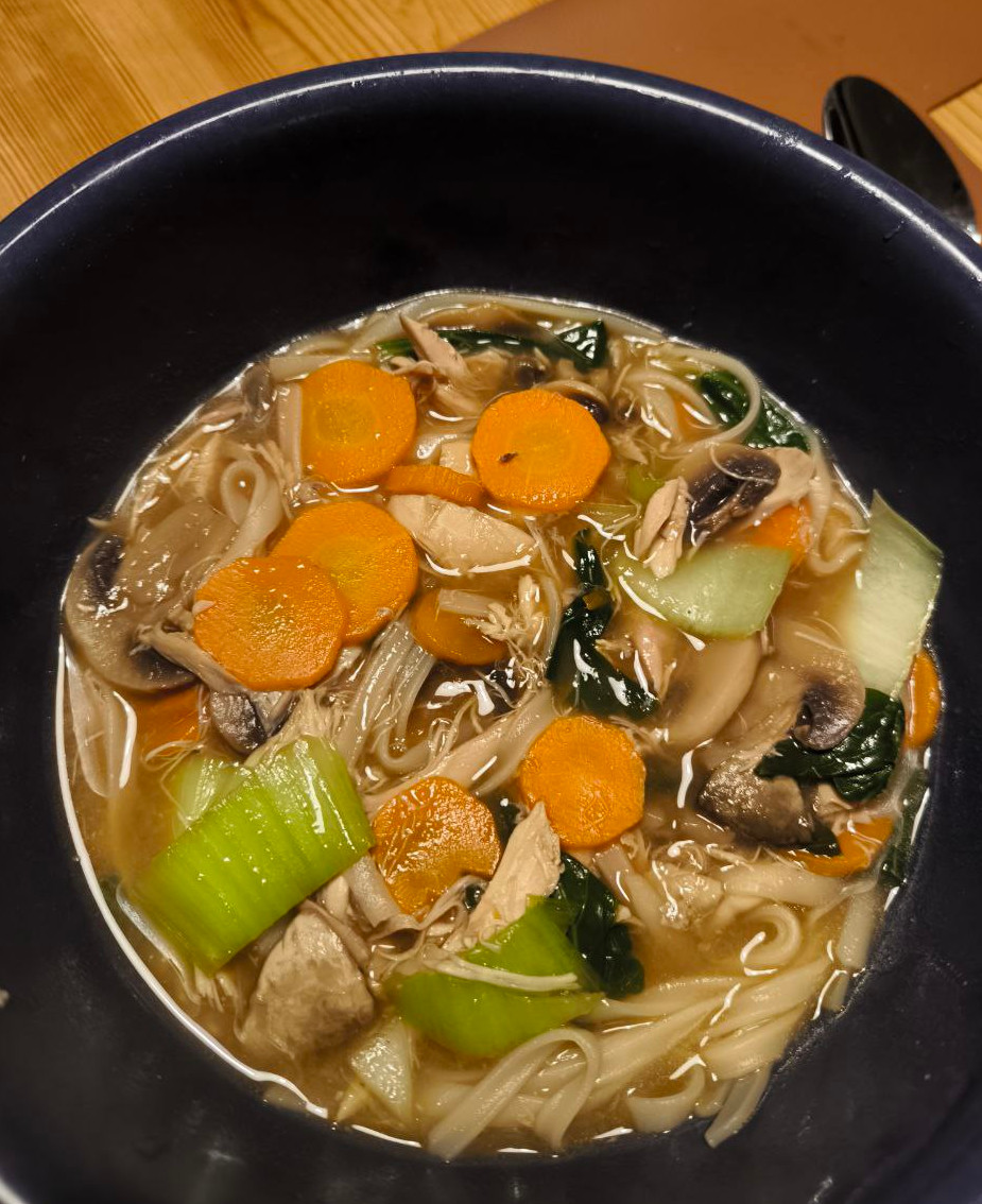 Los noodles y el pak choi se cocinan en los últimos minutos con el caldo hirviendo. Se añade la salsa de soja hasta ajustar el punto de sal.