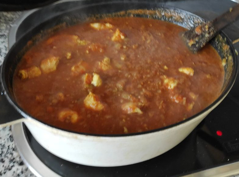 Seguidamente agregas el tomate triturado y media taza de agua o caldo de pollo. A esta salsa súper aromática, le agregas los trozos de pollo y los dejas cocinar corrigiendo sal y cualquier especia que consideres.